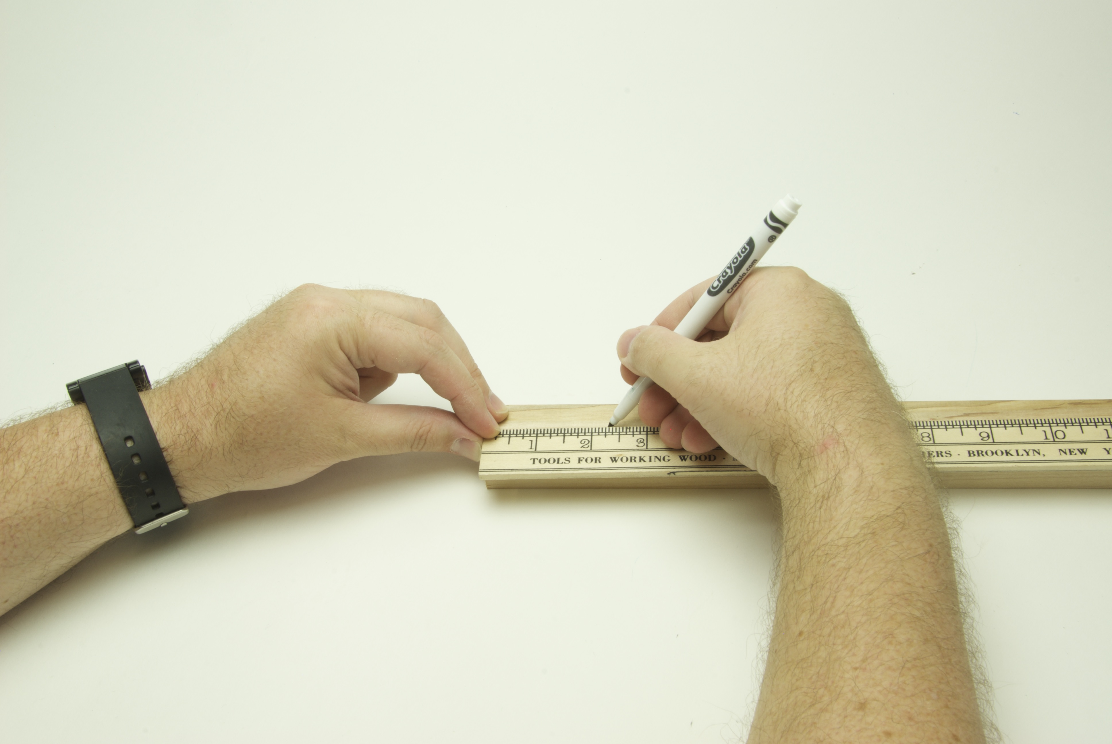 Cut a piece of your board to about 36″ long. Measure 3/4″ from the bottom and then 2-1/4″ from the bottom, making points in the middle of the board.