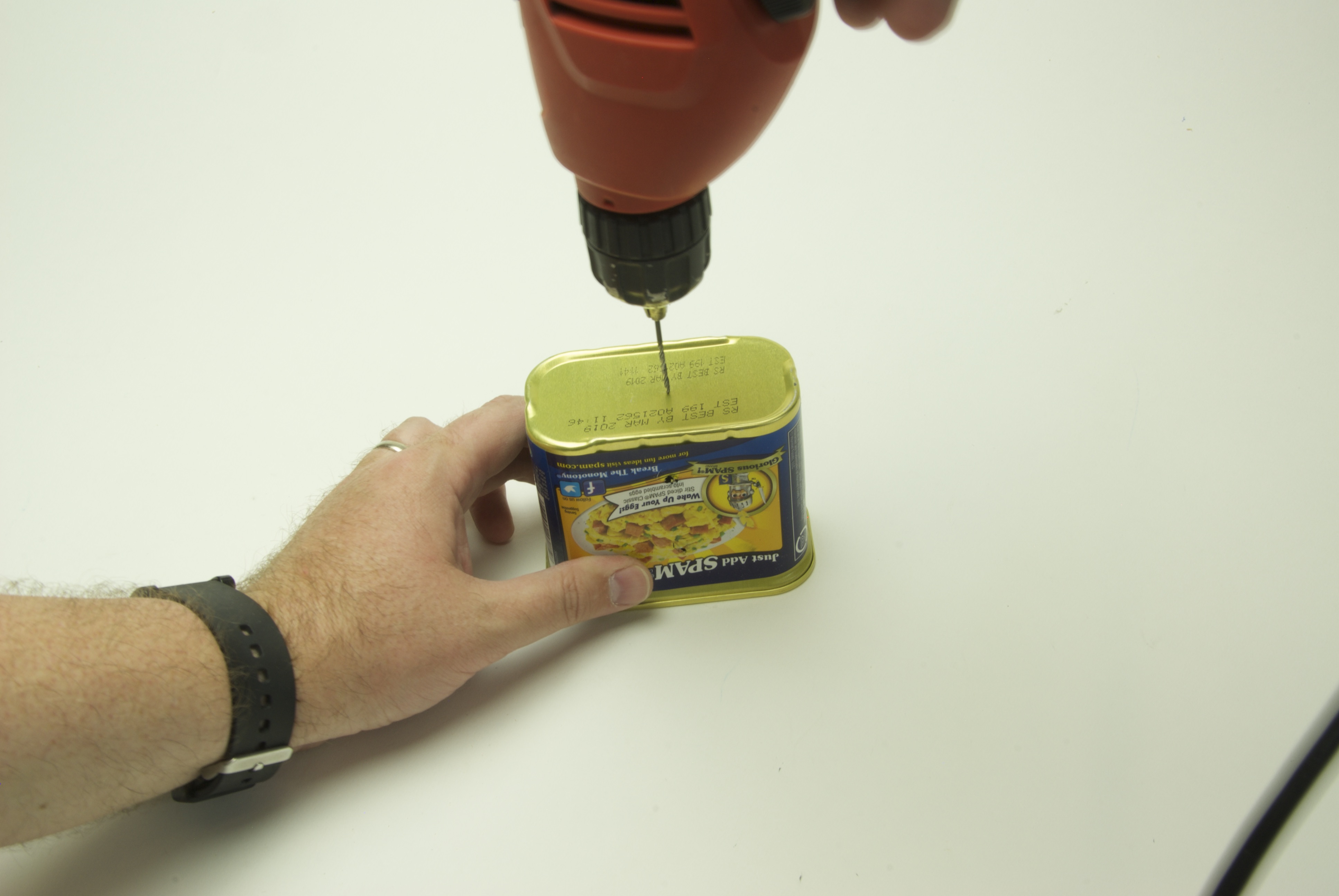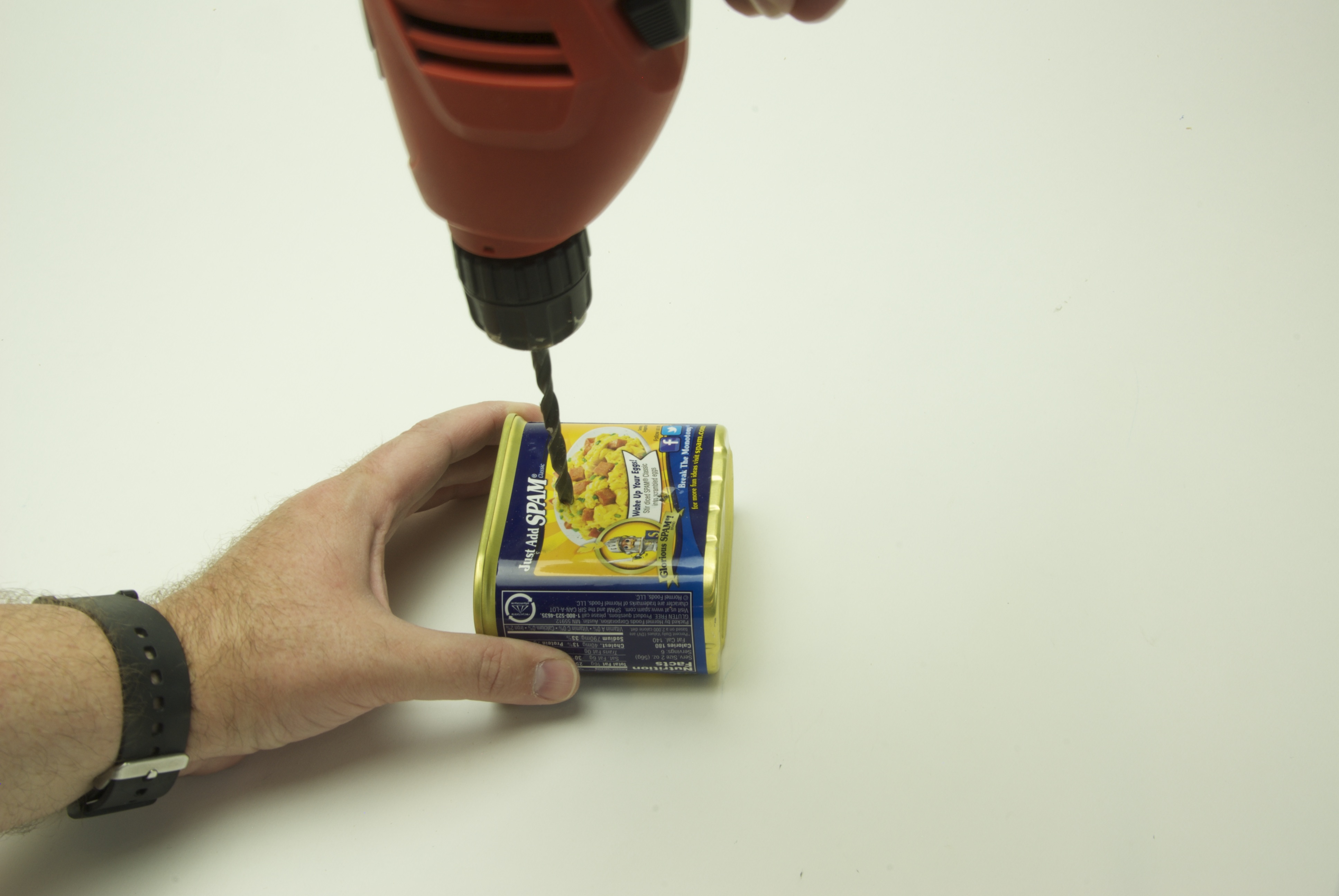 After cleaning out your can, measure a point 3/4″ from the bottom and another point 2-1/4″ from the bottom, and then drill them. Drill a small hole in the center of the bottom of the can.
