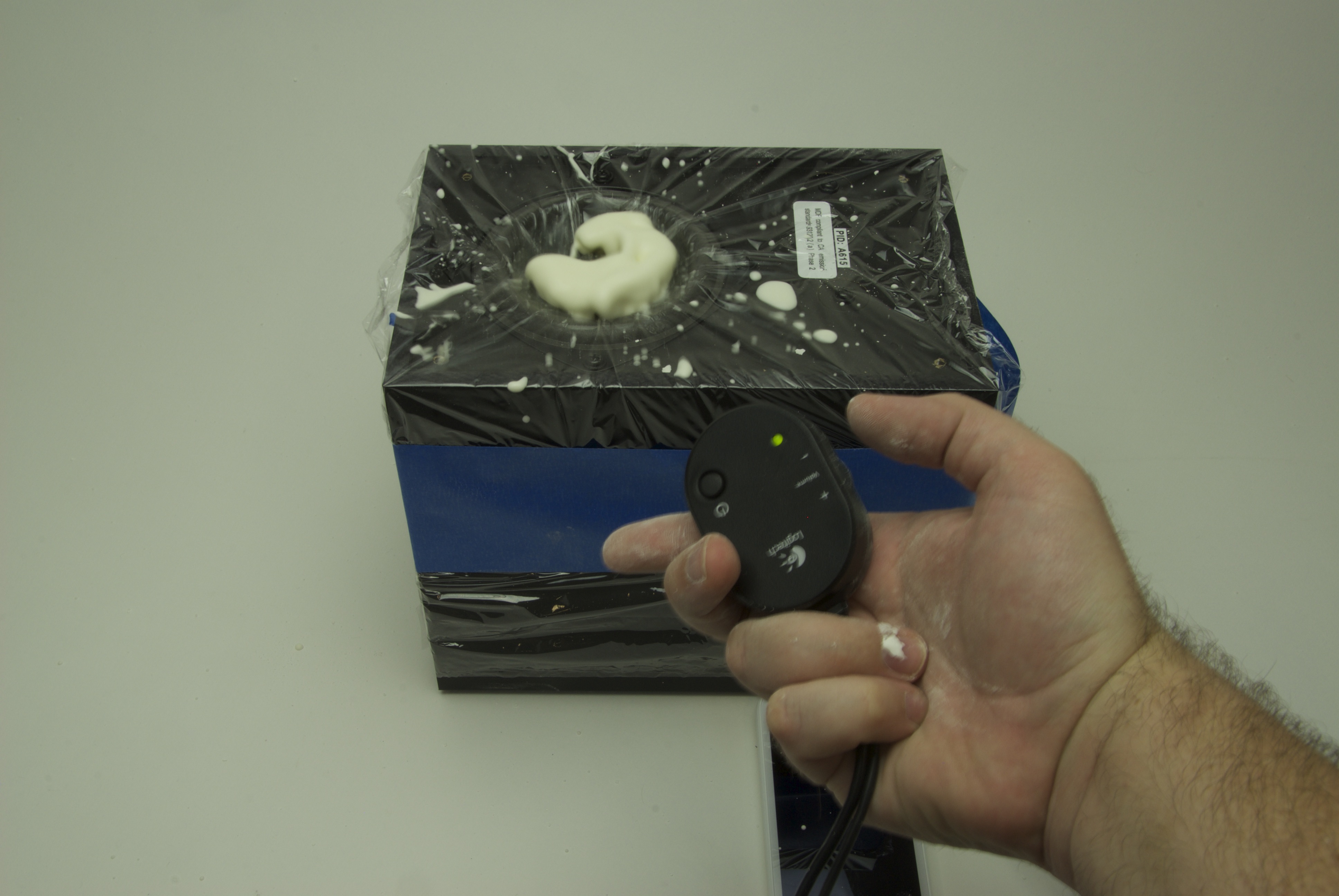 If your subwoofer has feet on the bottom, remove those first, then cover it with plastic wrap — this stuff can be messy. Make sure the plastic wrap is pressed gently into the speaker cone to make room for the Oobleck.