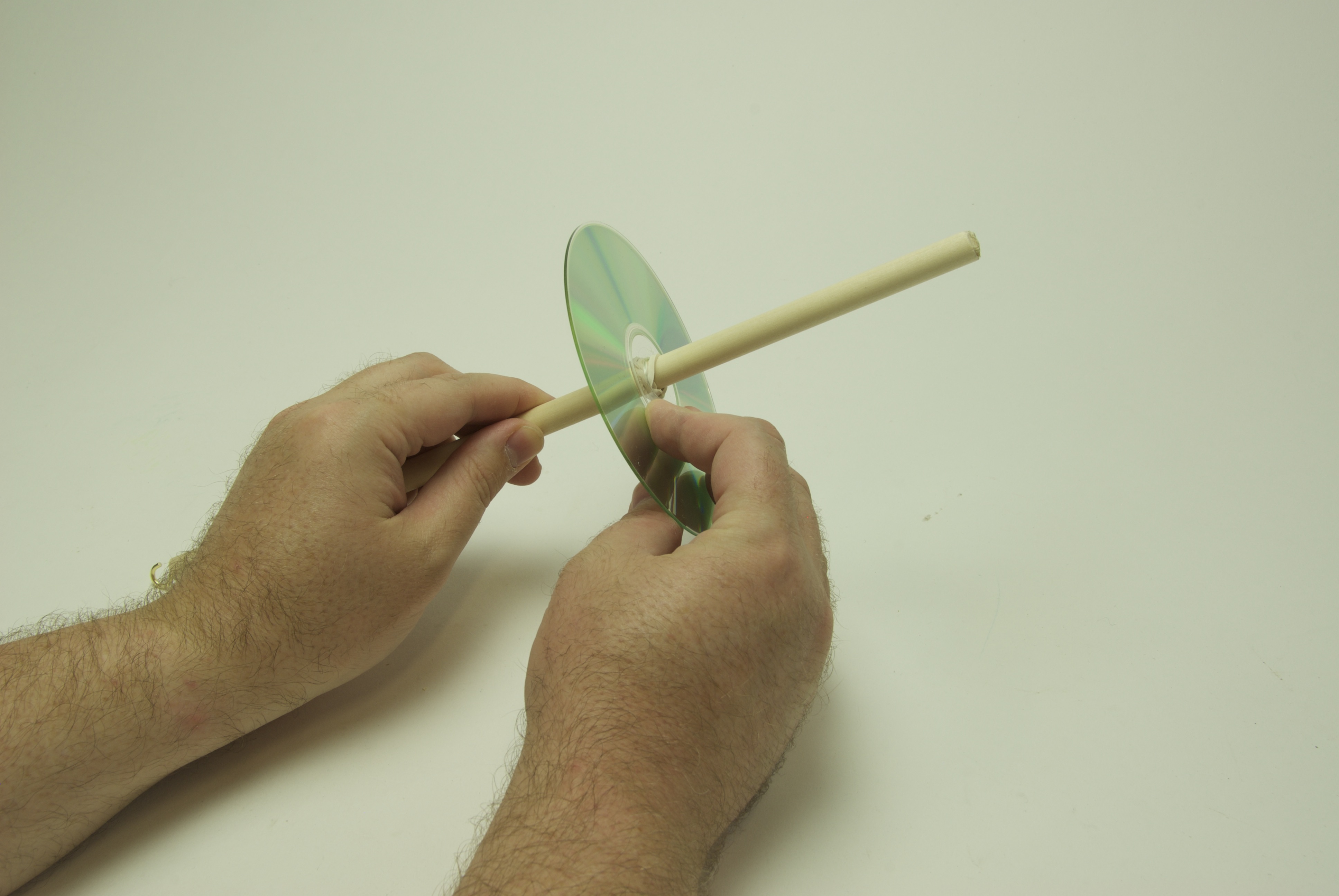 Slide the CD up the dowel to meet with the rubber band. Add the second rubber band to the bottom and slide it up to trap the CD between the two rubber bands.