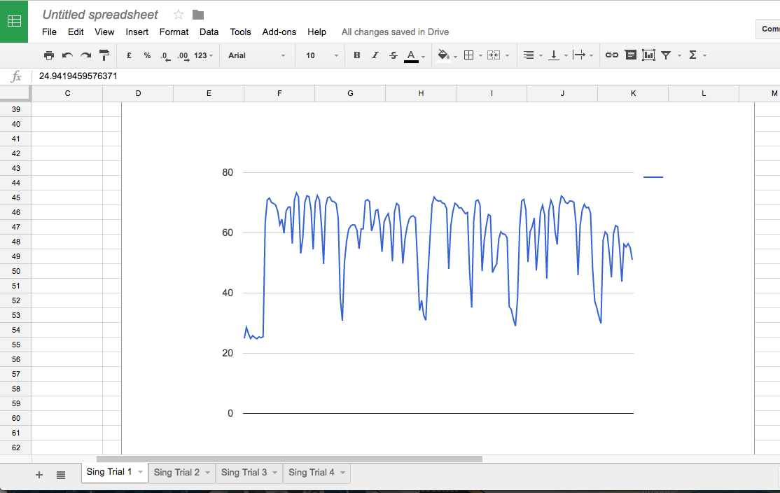 Once you have imported it into a new sheet, select the value column and make a new line graph. To do this, select the top value under the “value” column, scroll down to the bottom of the list, and hold down the shift key while clicking the last value. This will select only the values column, which we can then turn into a line graph.