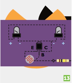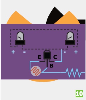 Connect the transistor’s emitter and base to the legs of the light sensor.
