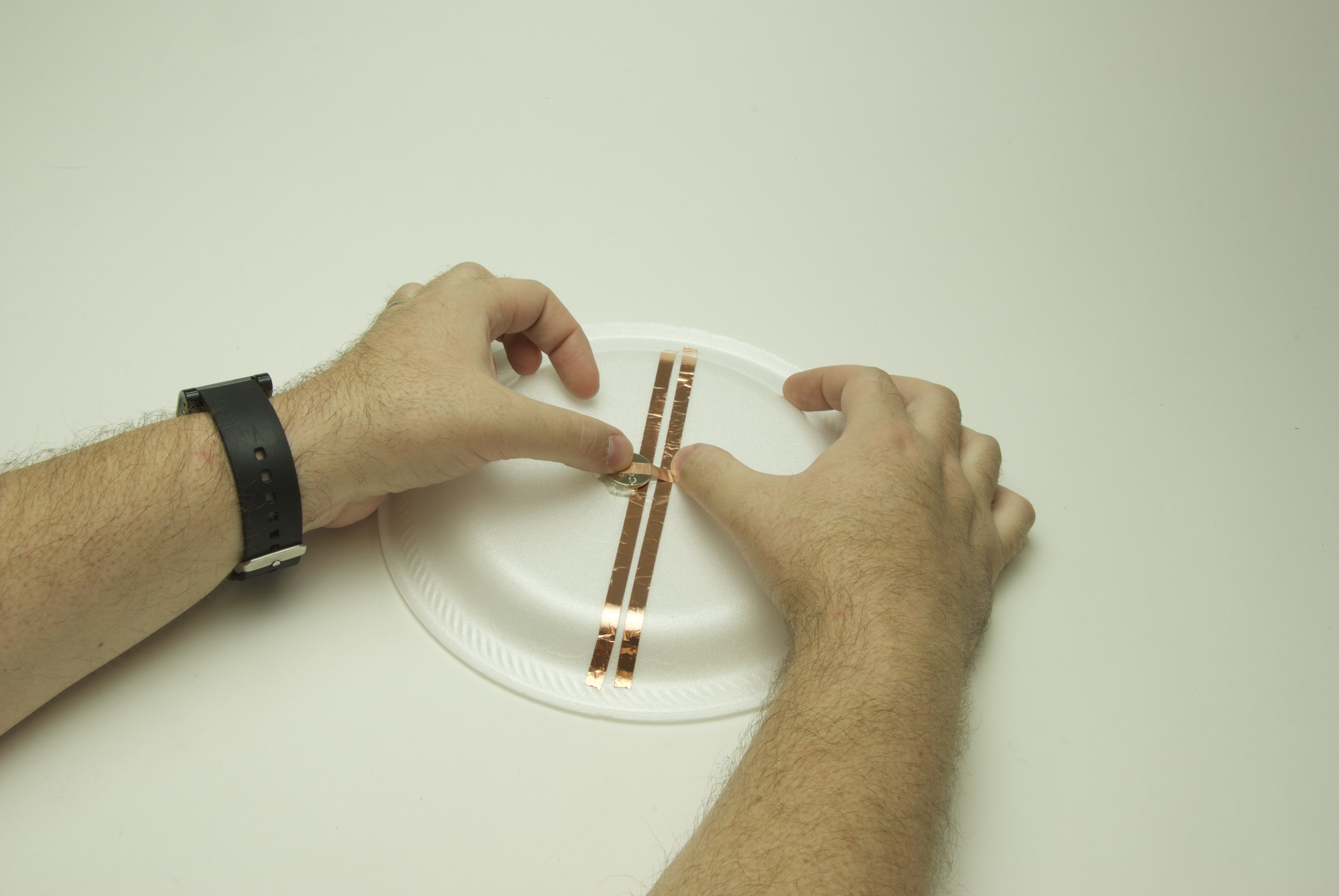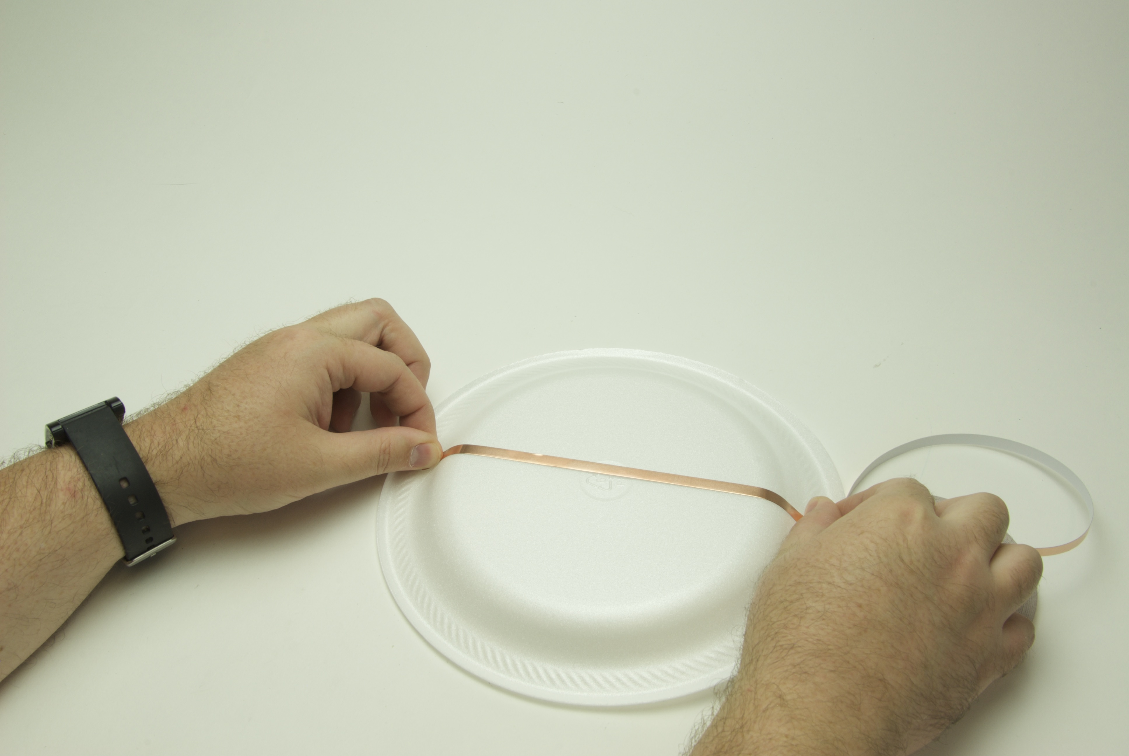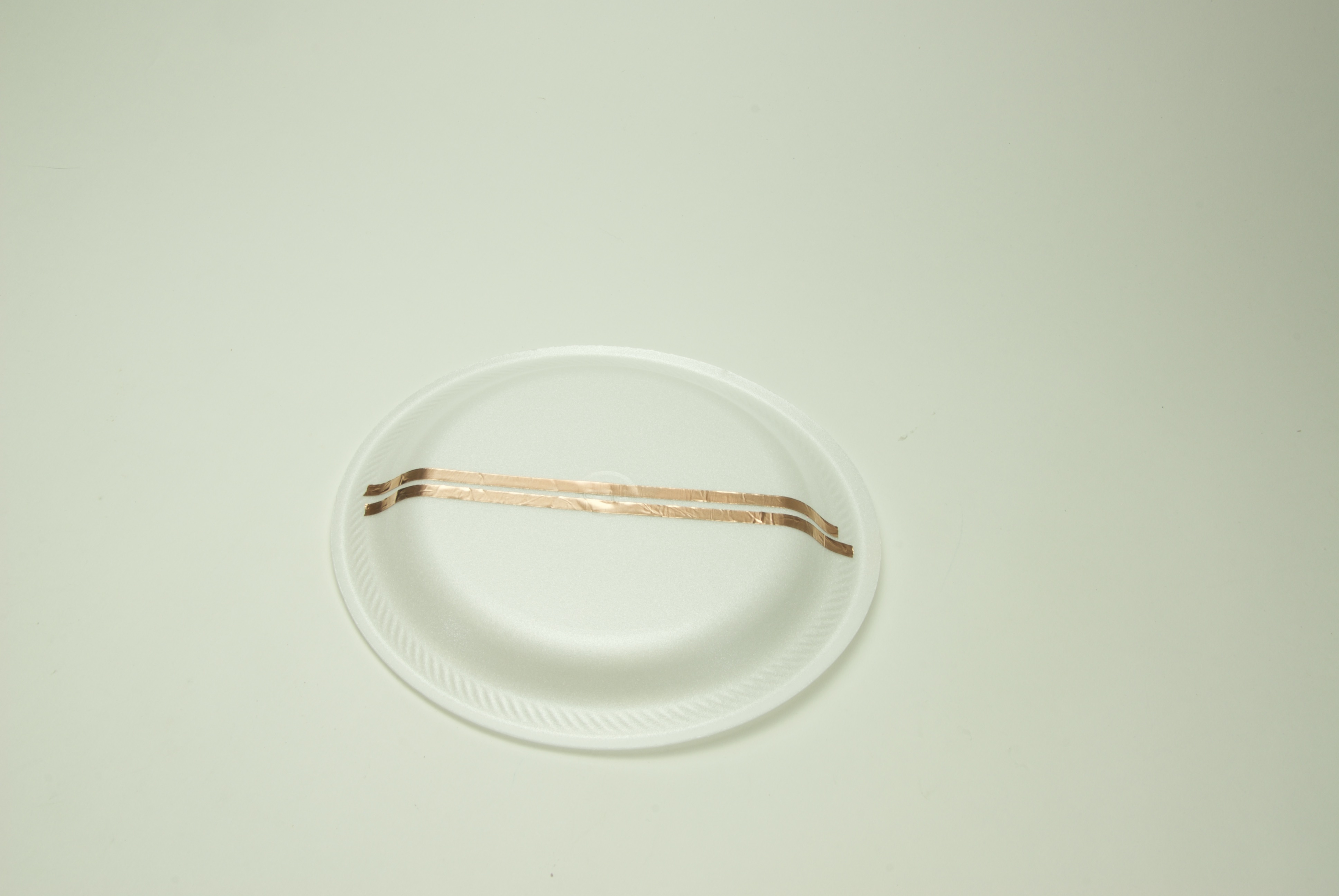 Add two strips of copper tape across the bottom of one of the plates. Make sure the strips are parallel and spaced about 1/8 inch apart.