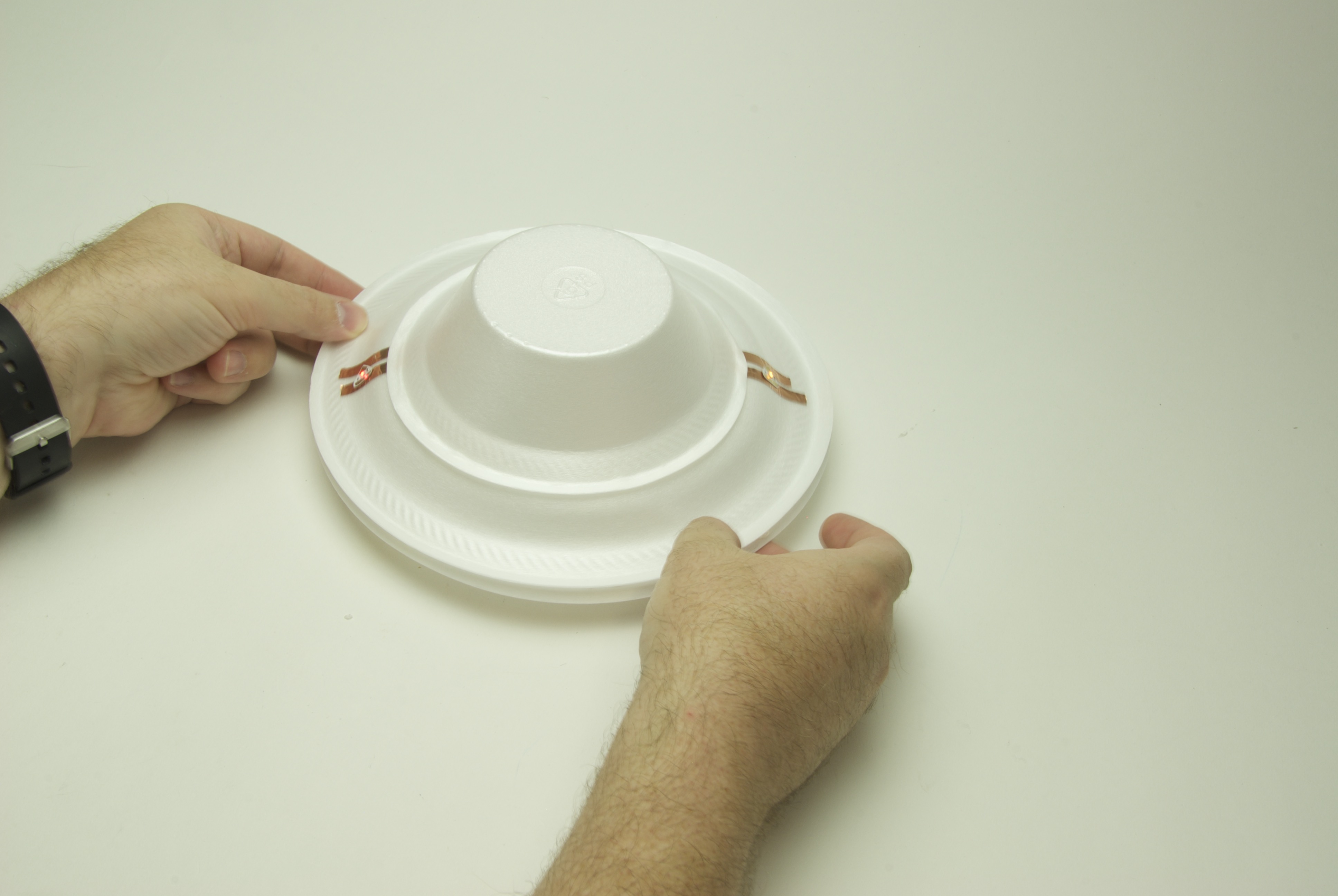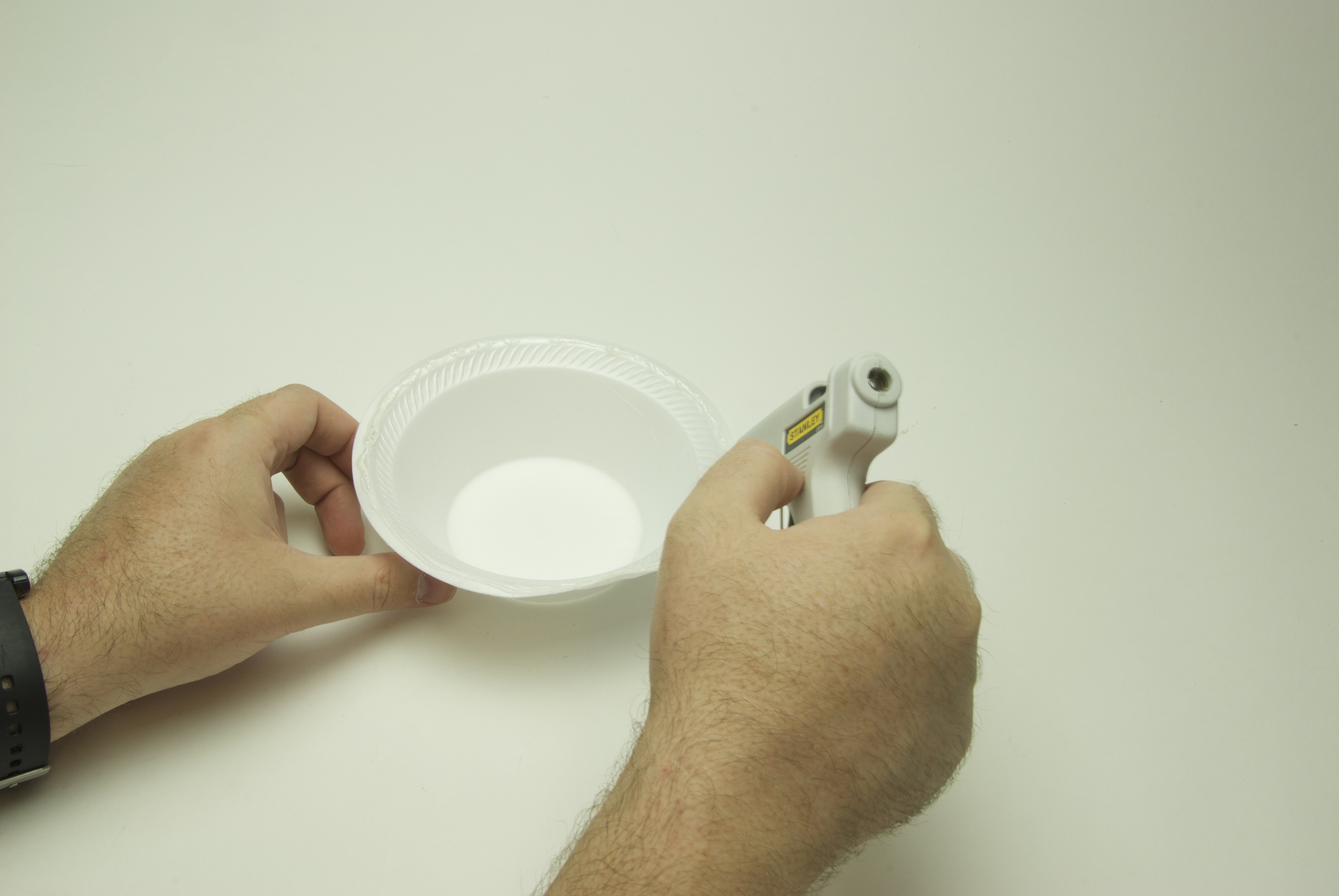 Add hot glue around the edge of the bowl and quickly press it down centered on the plate over the battery.