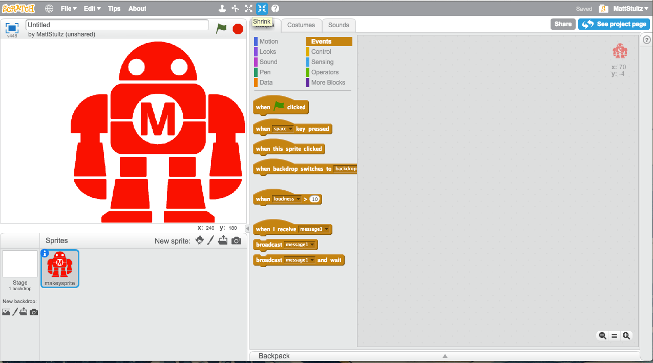 Wow, Makey came in giant, let’s shrink him down a bit. In the top of the screen there is a shrink button. Click on that and then click on Makey to scale him down some. Now drag him to the lower left corner as a starting point.