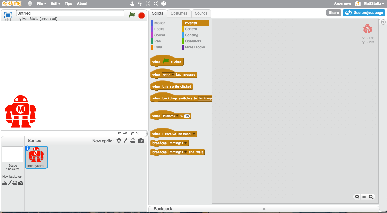 To start a Scratch game, you click on the green flag. Click on the events section on the scripts tab to find the “When Flag Clicked” event and drag it right into Makey’s script section.