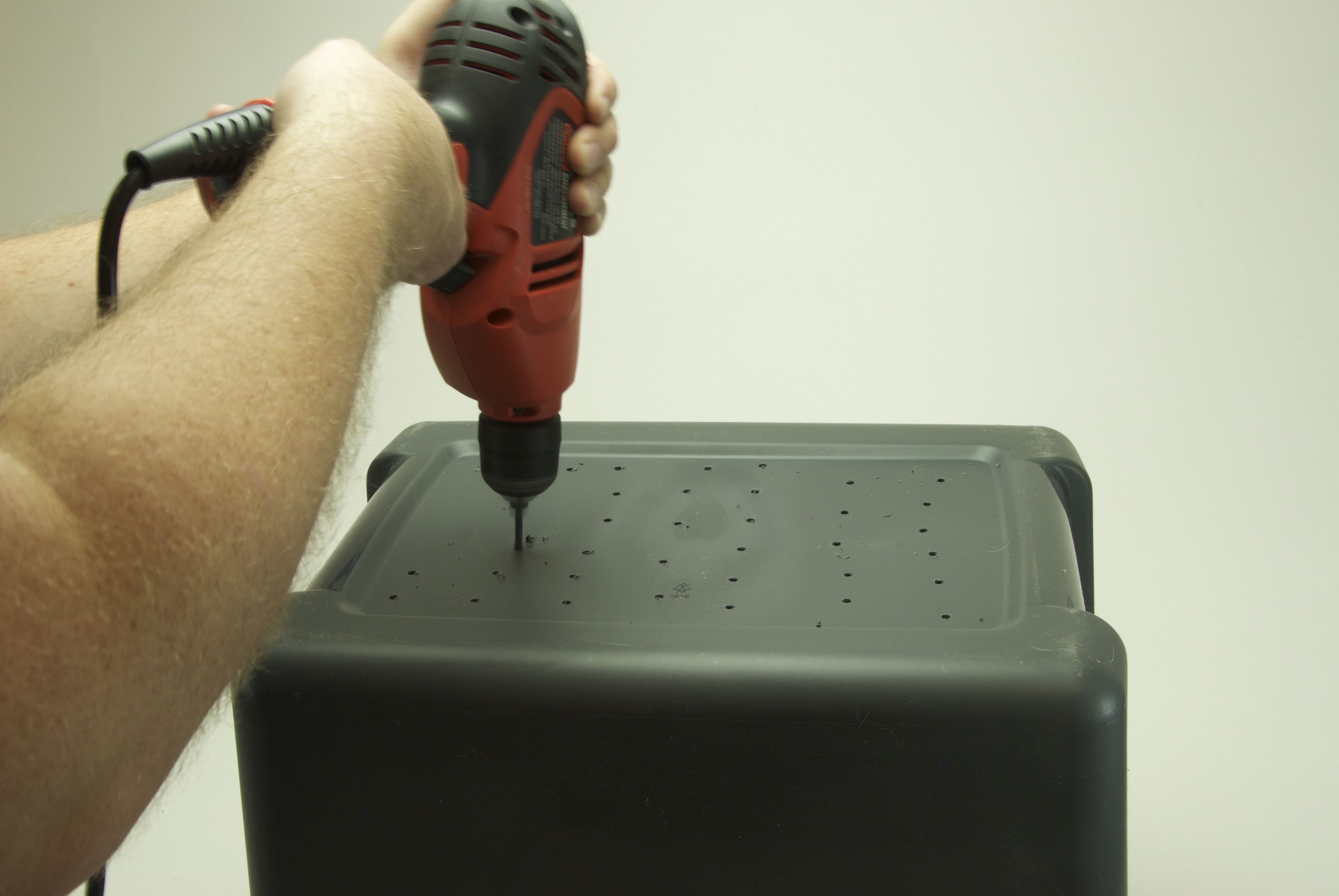 Drill more air holes in one of the bin lids. You won’t need the other lid but it will be good to keep around if you need to seal the collection bin for transportation.