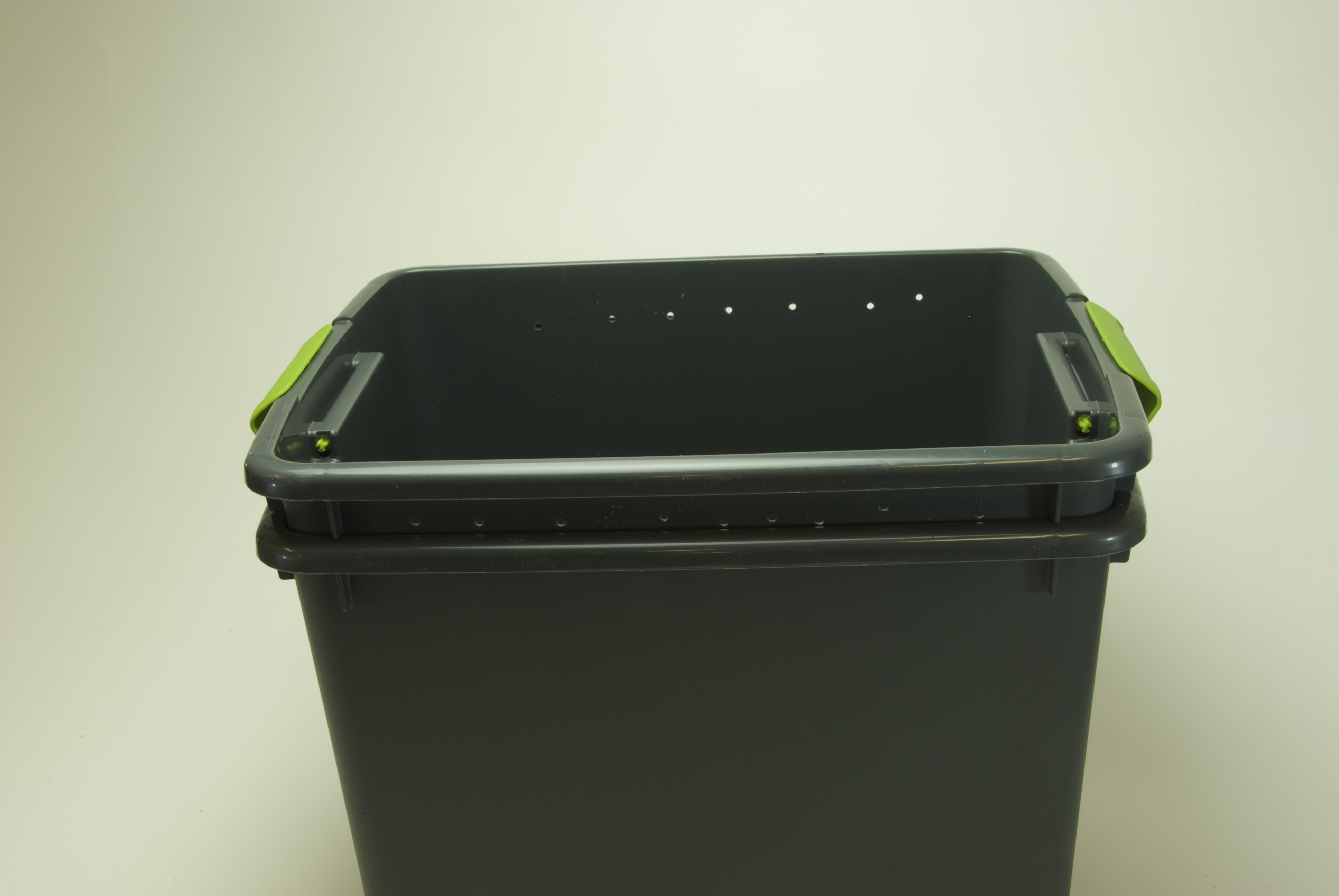 Drill holes along the top section of that same bin you just drilled in Step 1. This will let air come in when the two bins are nested together.